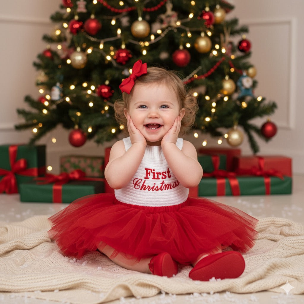 - Design Charmoso: Este romper apresenta um adorável bordado em vermelho com a frase "First Christmas", que traz um toque festivo e memorável às celebrações.